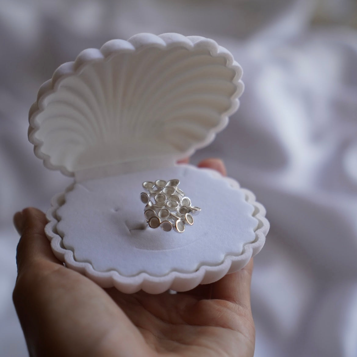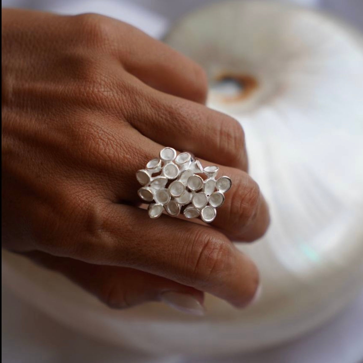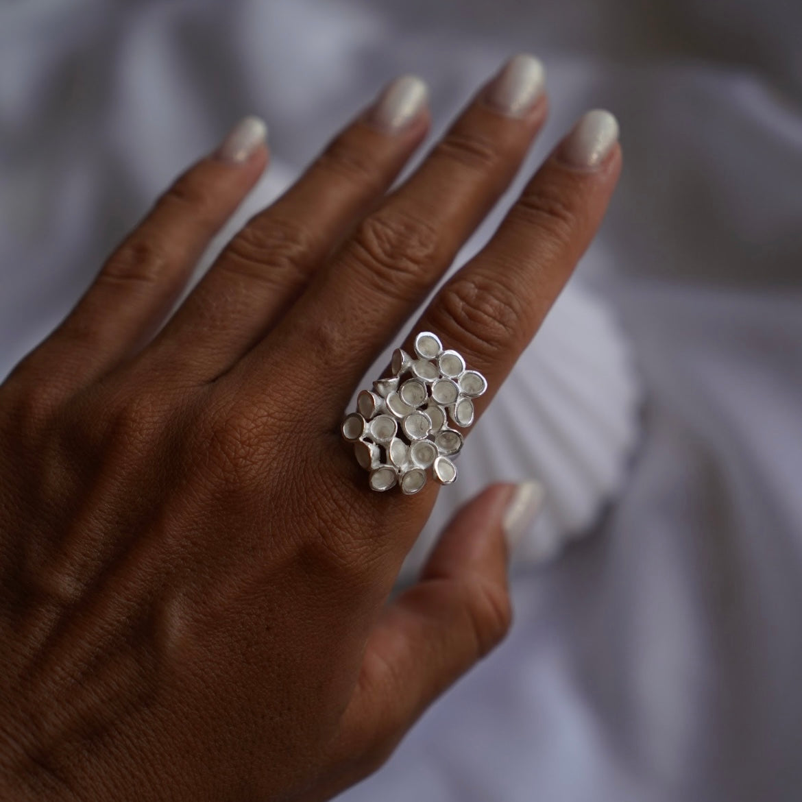 This statement ring is crafted from sterling silver and inspired by the delicate forms of ocean coral. Each tiny dome of silver glows with soft nacre-like reflections, clustered together like an underwater bloom rising from the reef.