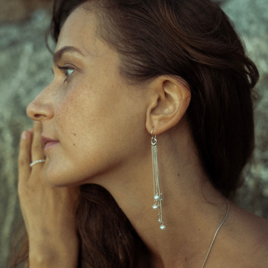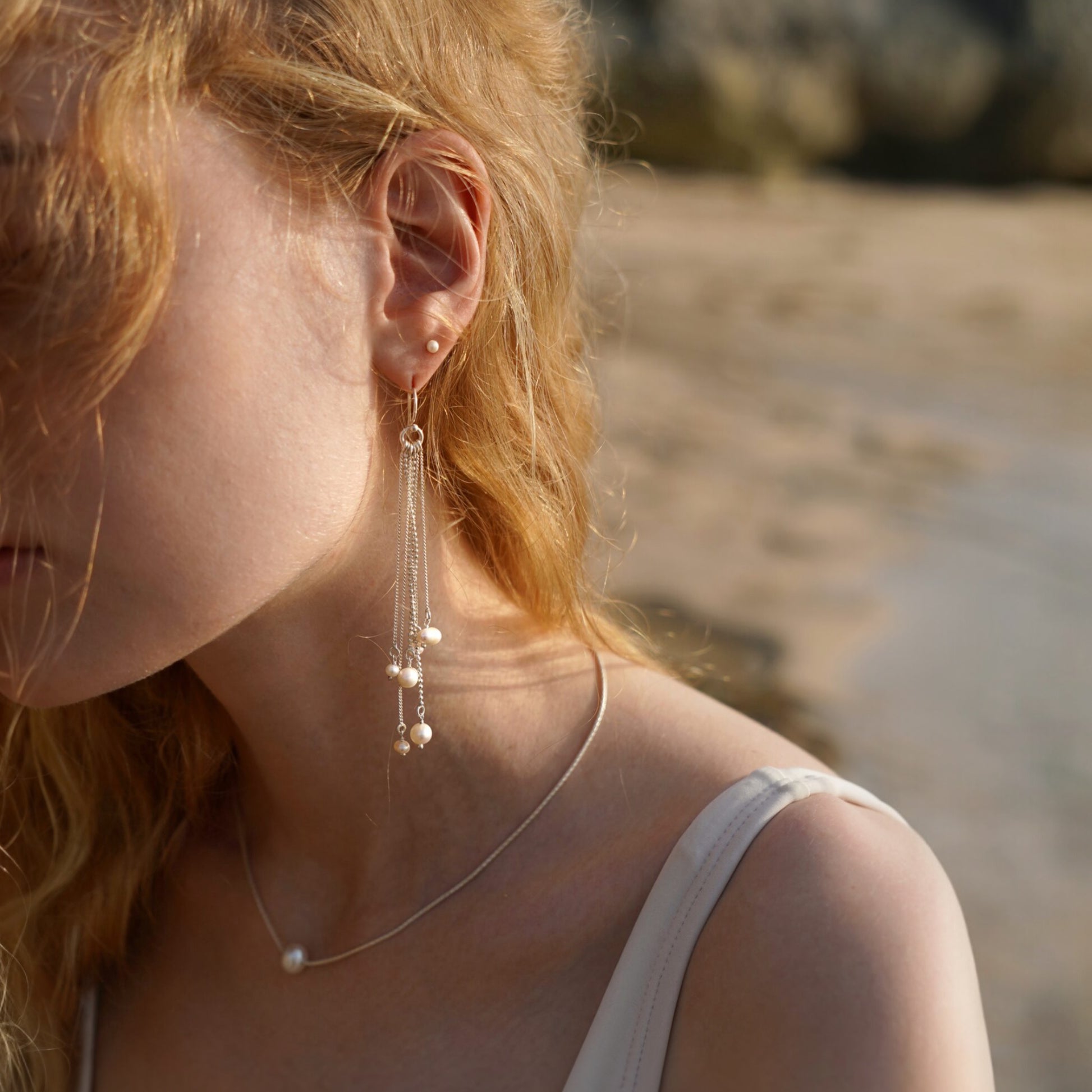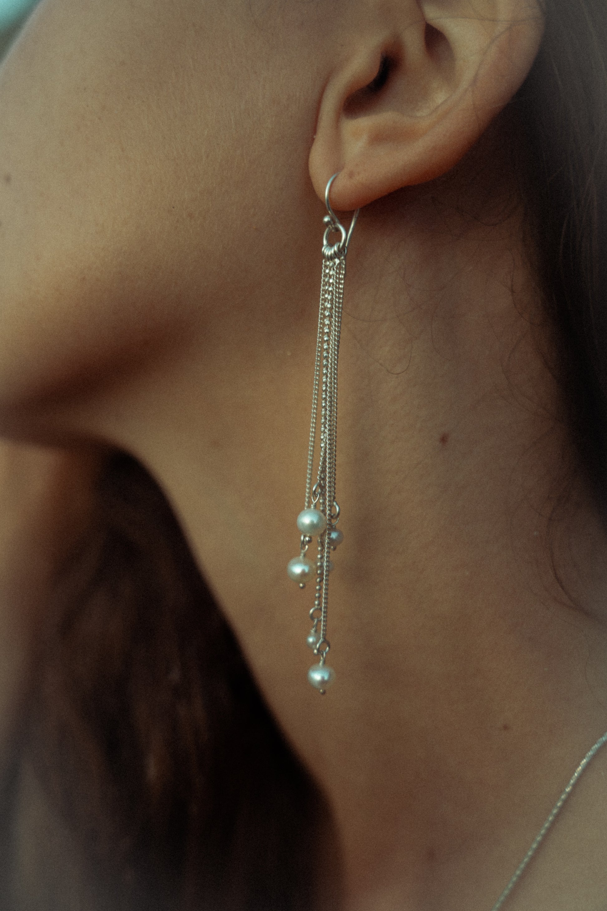 Cuelgue con estilo estos pendientes de plata adornados con cadenas de plata colgantes y delicados pendientes pequeños de diferentes formas y tamaños. Perlas.