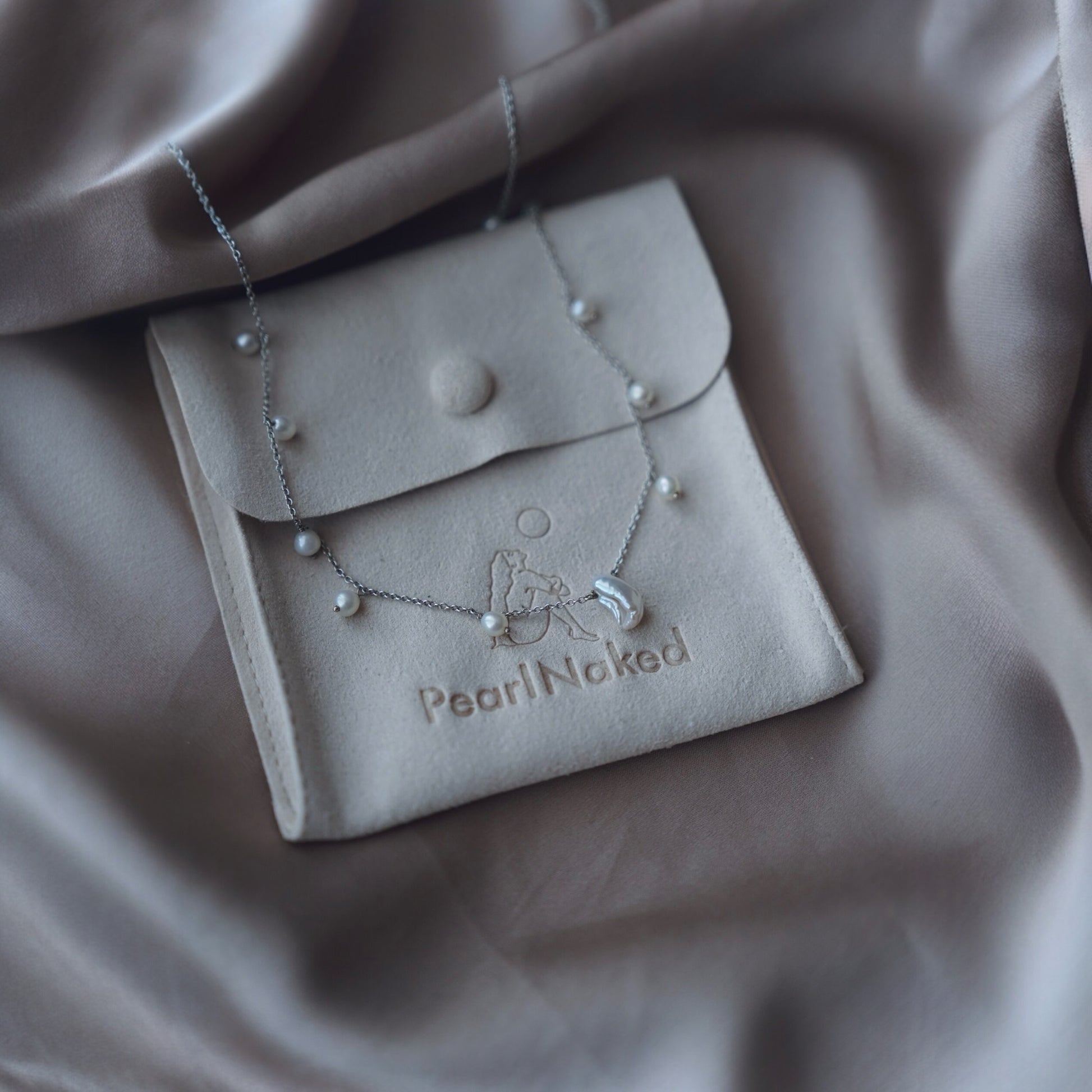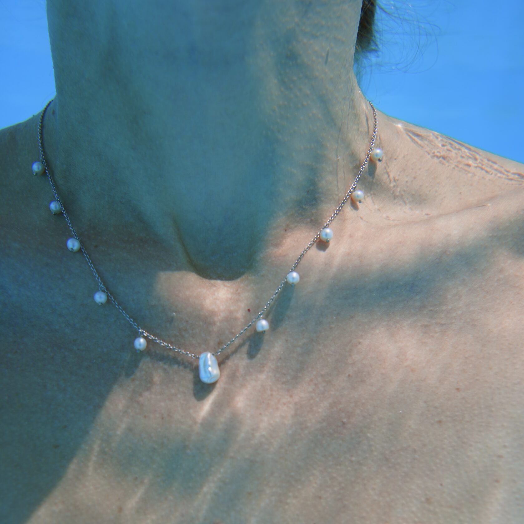 Cadena de plata adornada con pequeñas perlas y una distintiva perla grande y desigual en su centro.