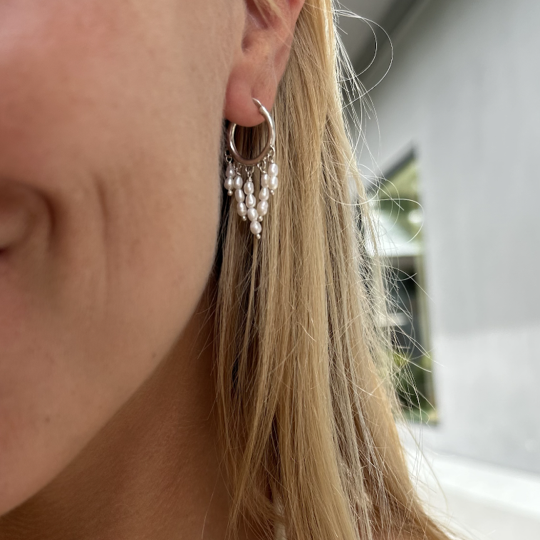 Materiales: aro elaborado en plata 925 con pequeñas perlas de agua naturales colgantes.
