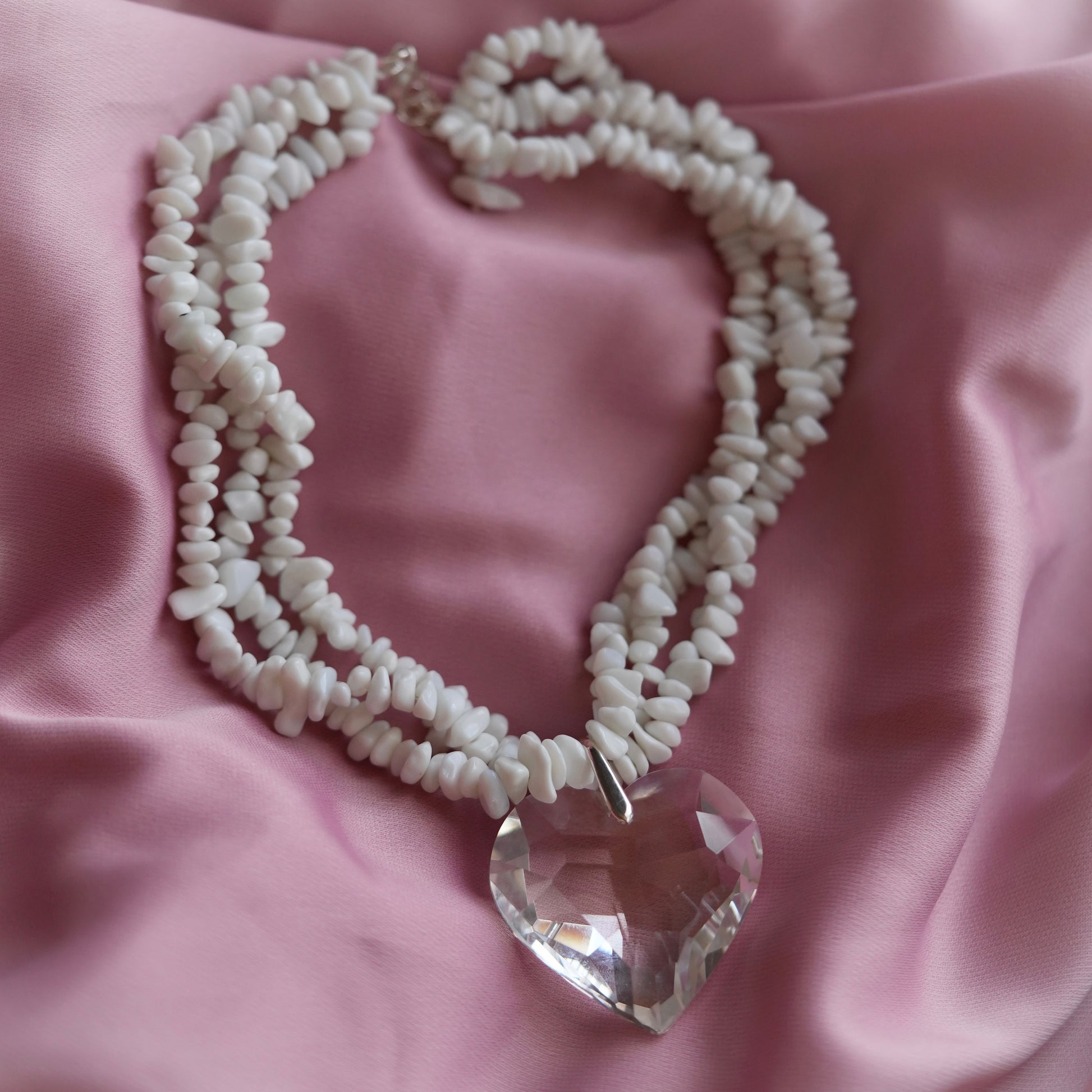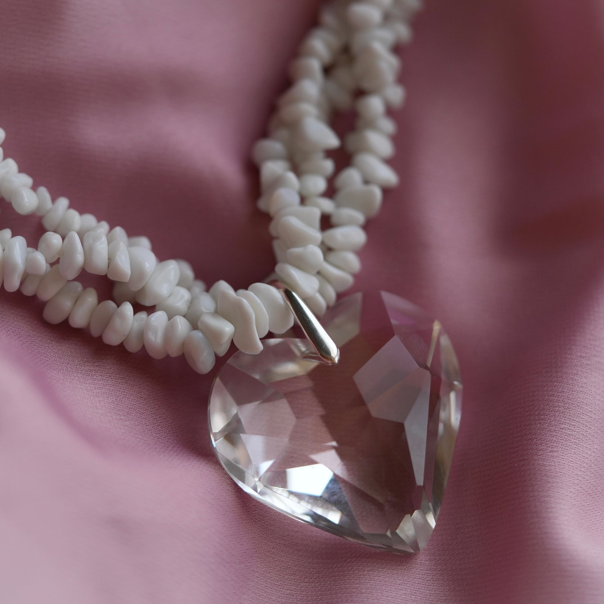 Big glass heart hanging in the middle of 39cm white mineral stones chain with 4cm 925 silver extension and shell in the end.