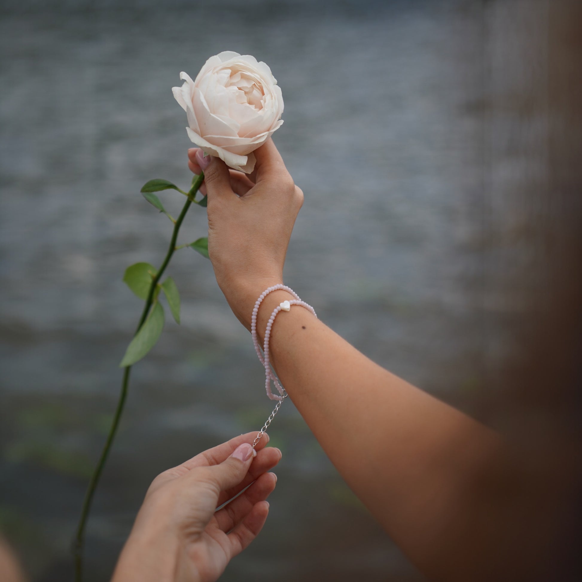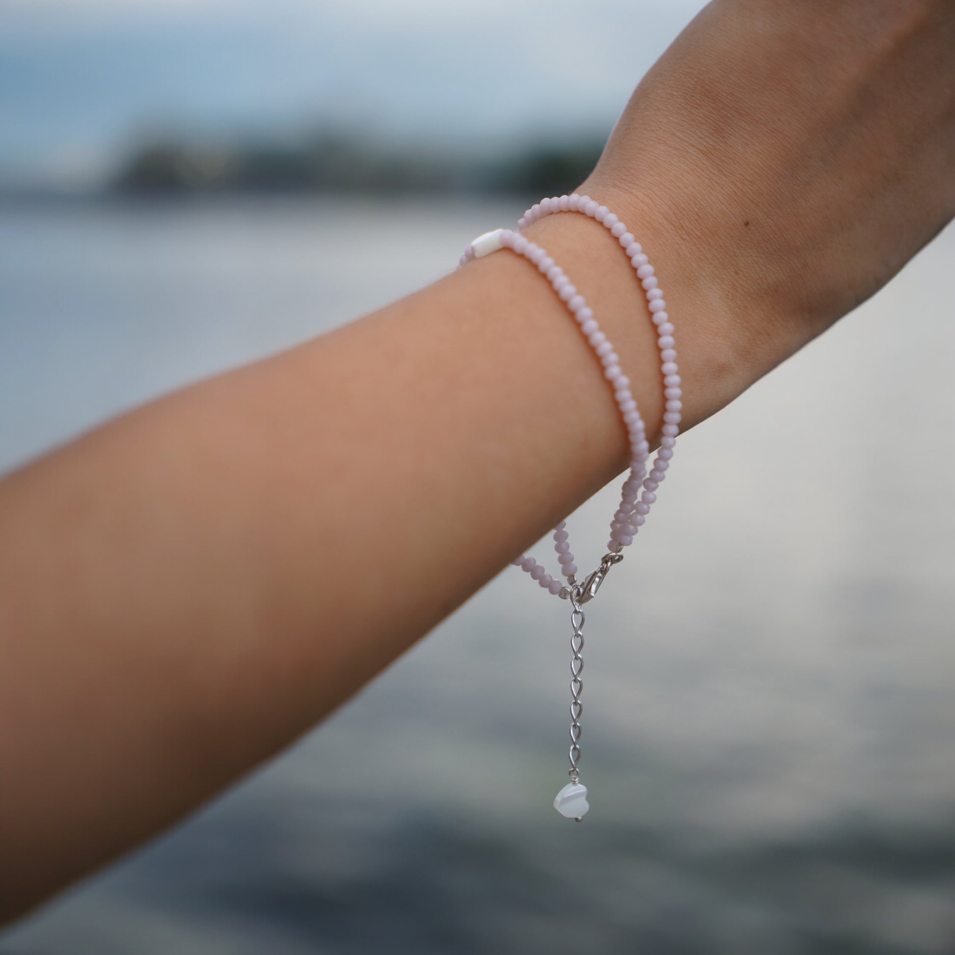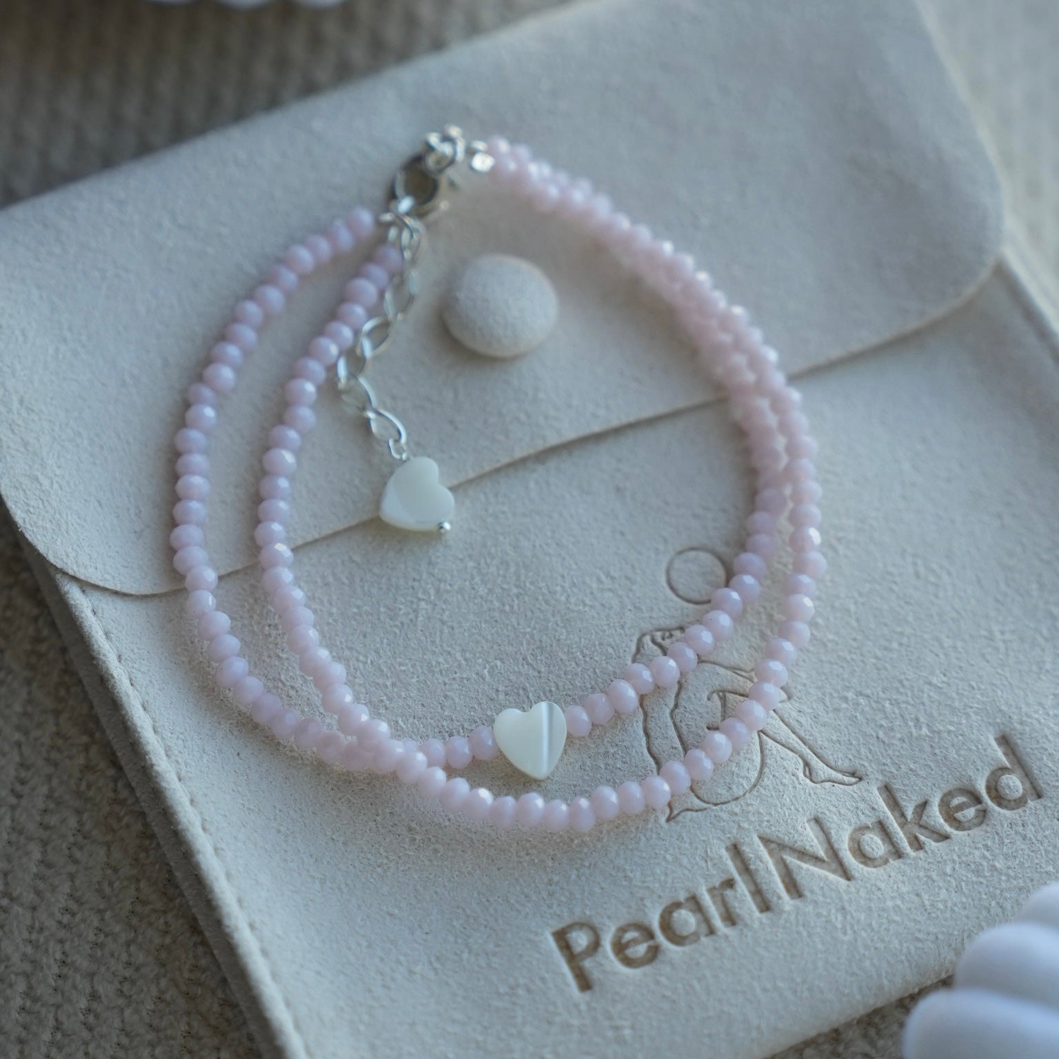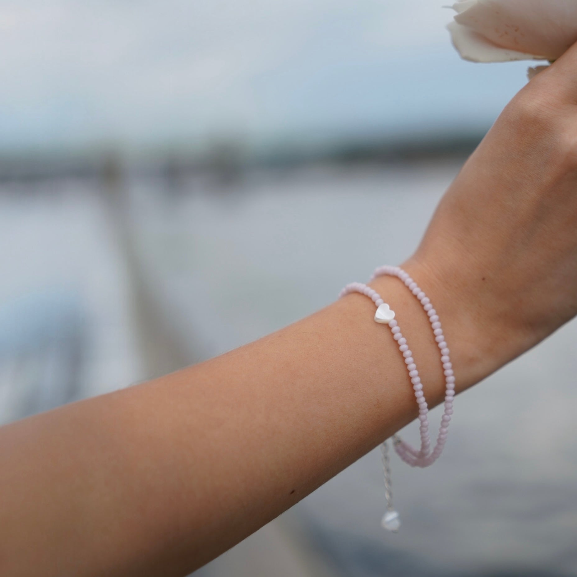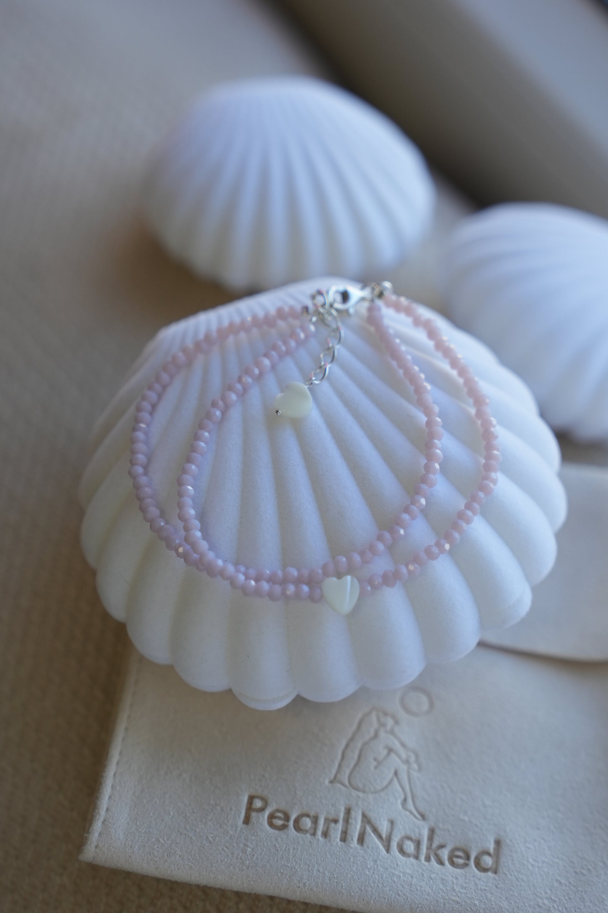 Pulsera realizada con cristales violetas con corazón de nácar en el centro, asegurada mediante cierre de plata con extensión, y delicadamente rematada con un corazón de nácar al final.