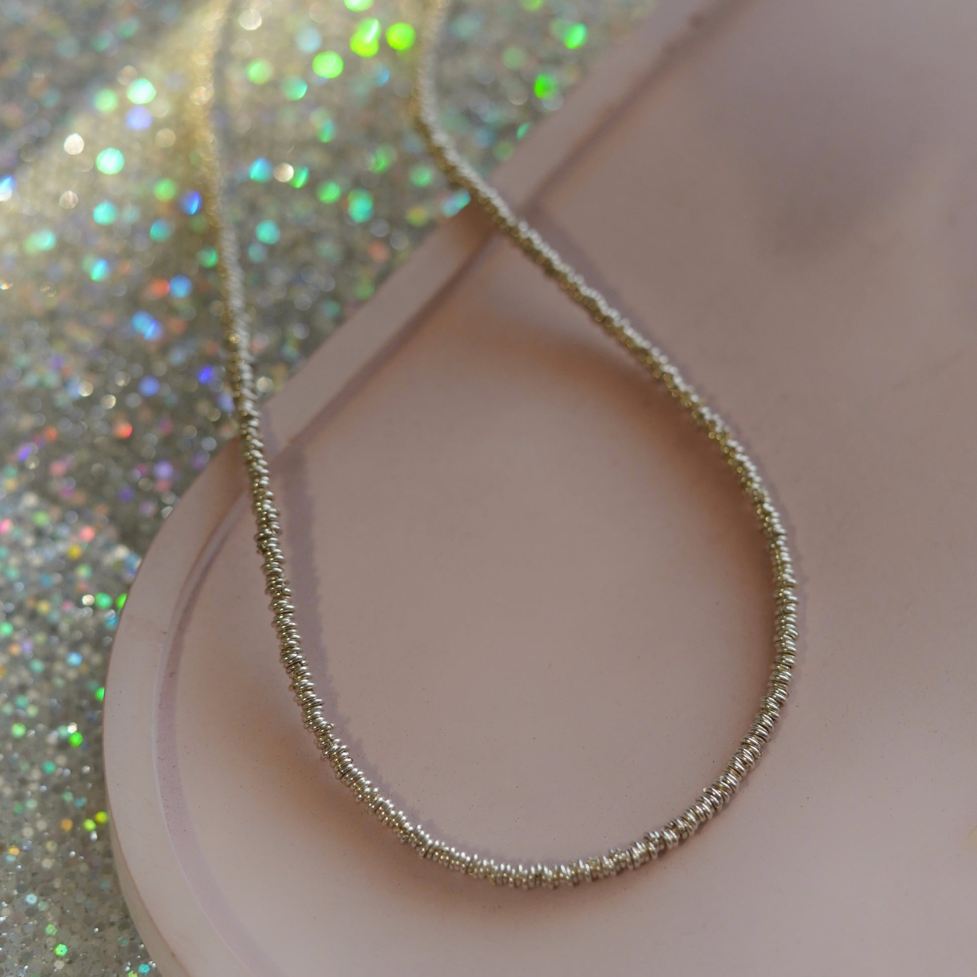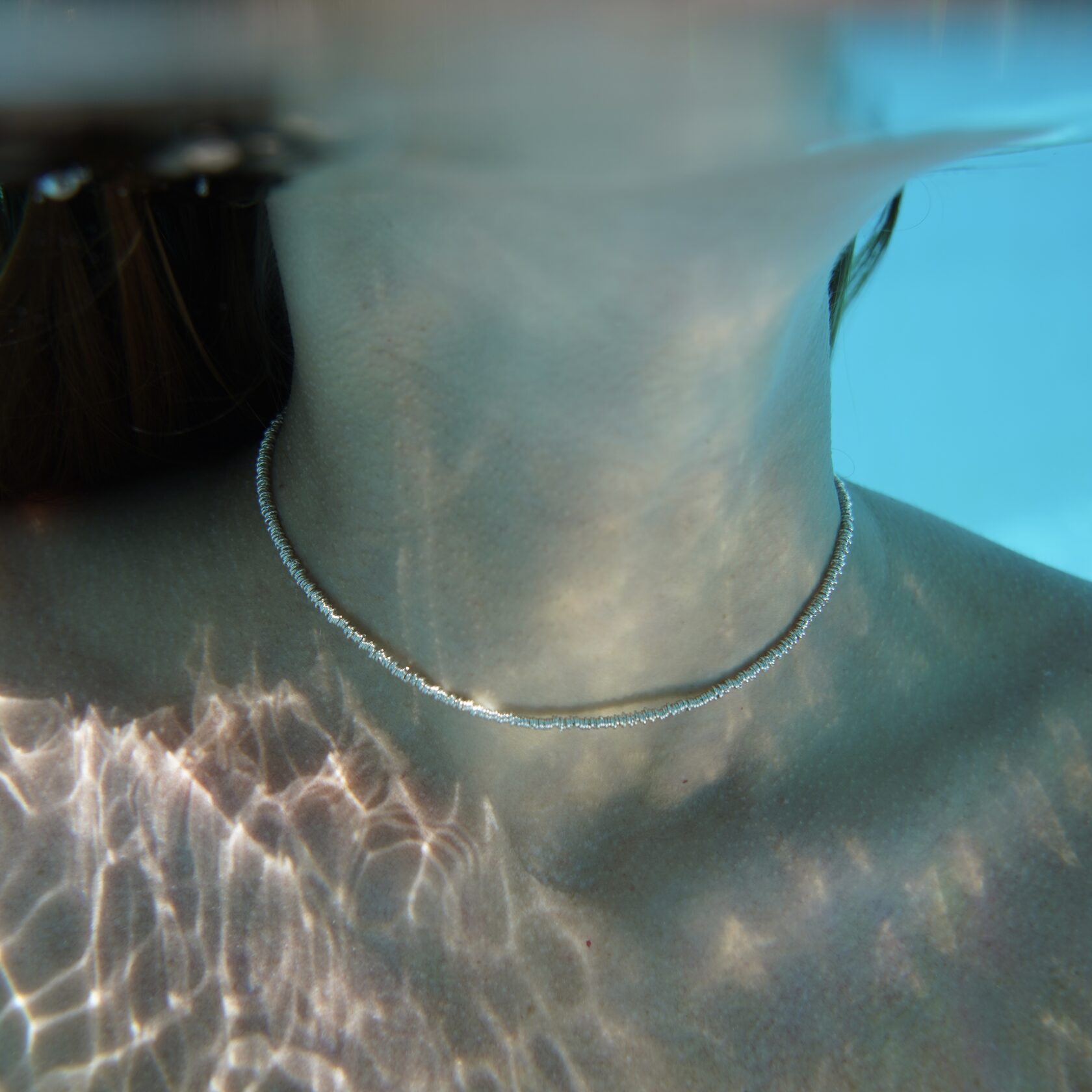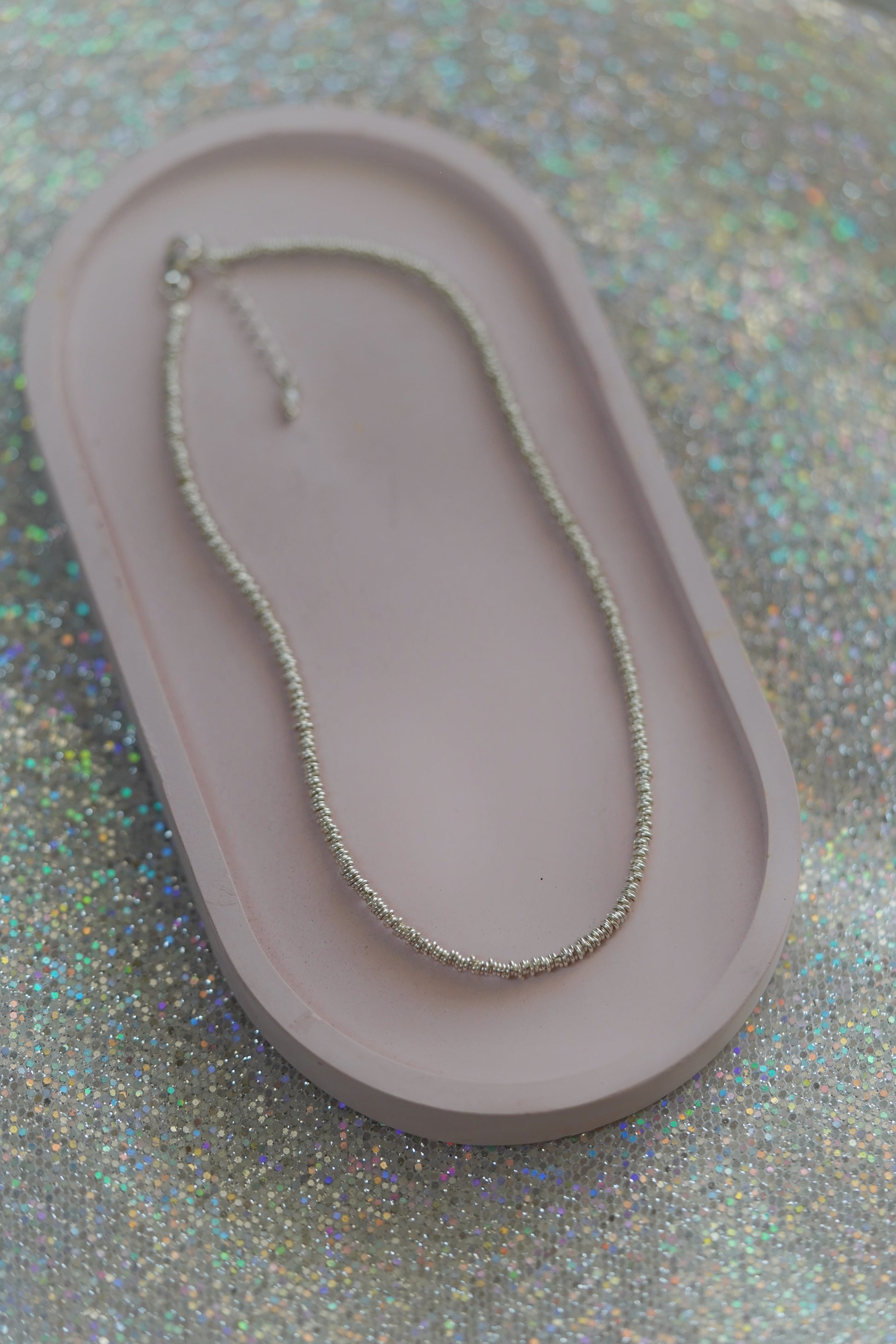 Gargantilla de plata 925, largo 34 cm con extensión de plata de 4 cm y pequeña perla en el extremo.