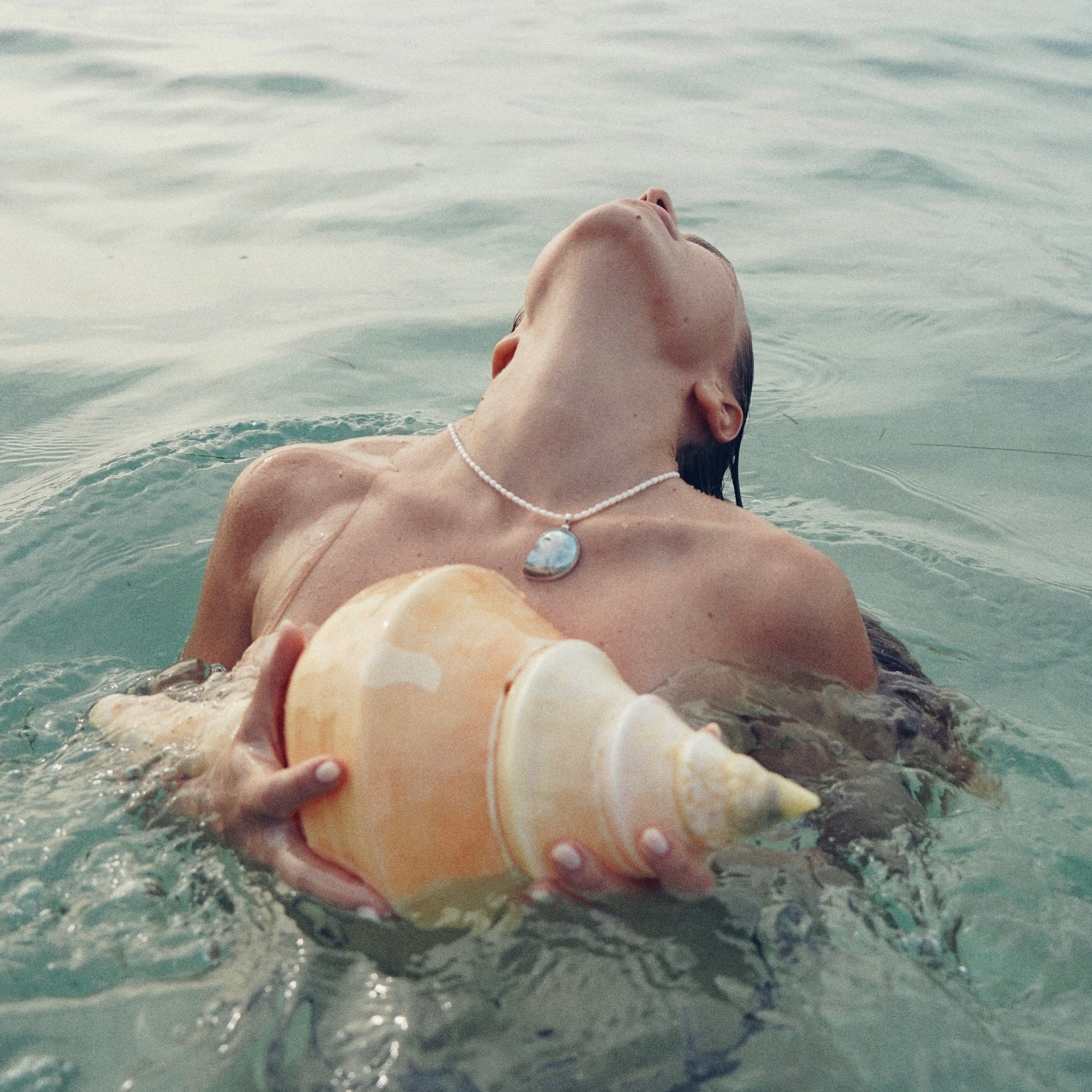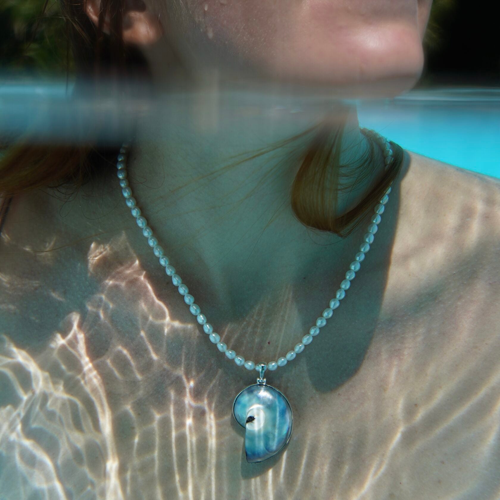 Detalles: Concha de nautilus con epoxi sobre cadena de perlas naturales tamaño mediano.