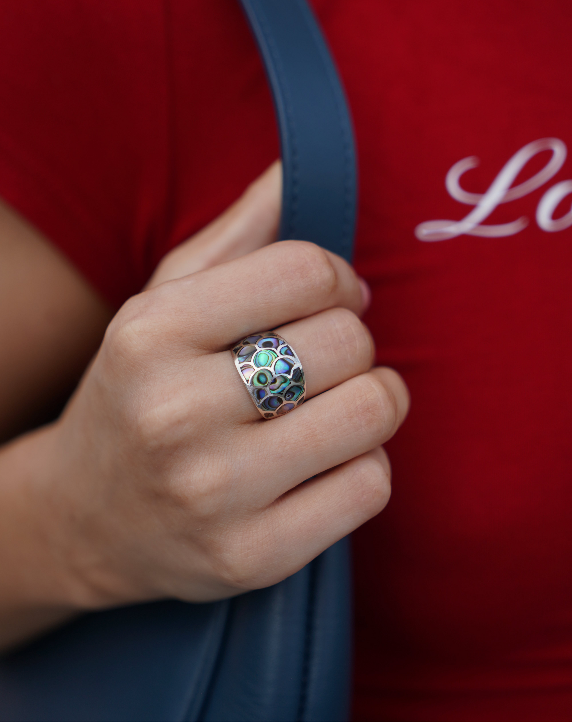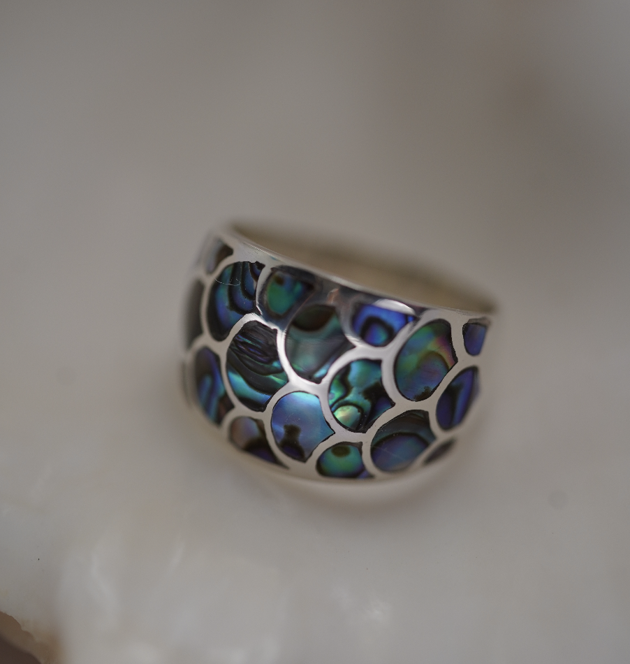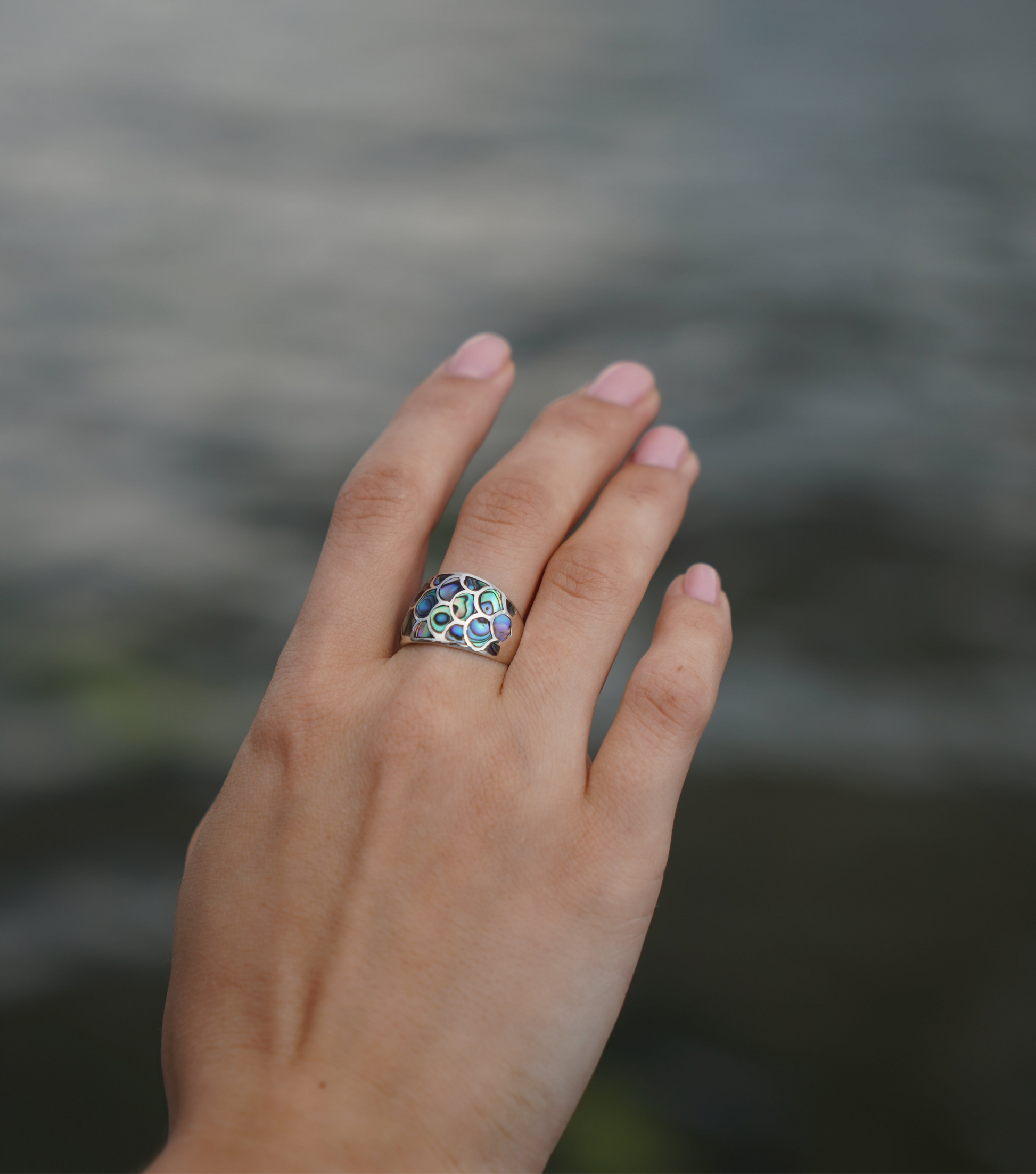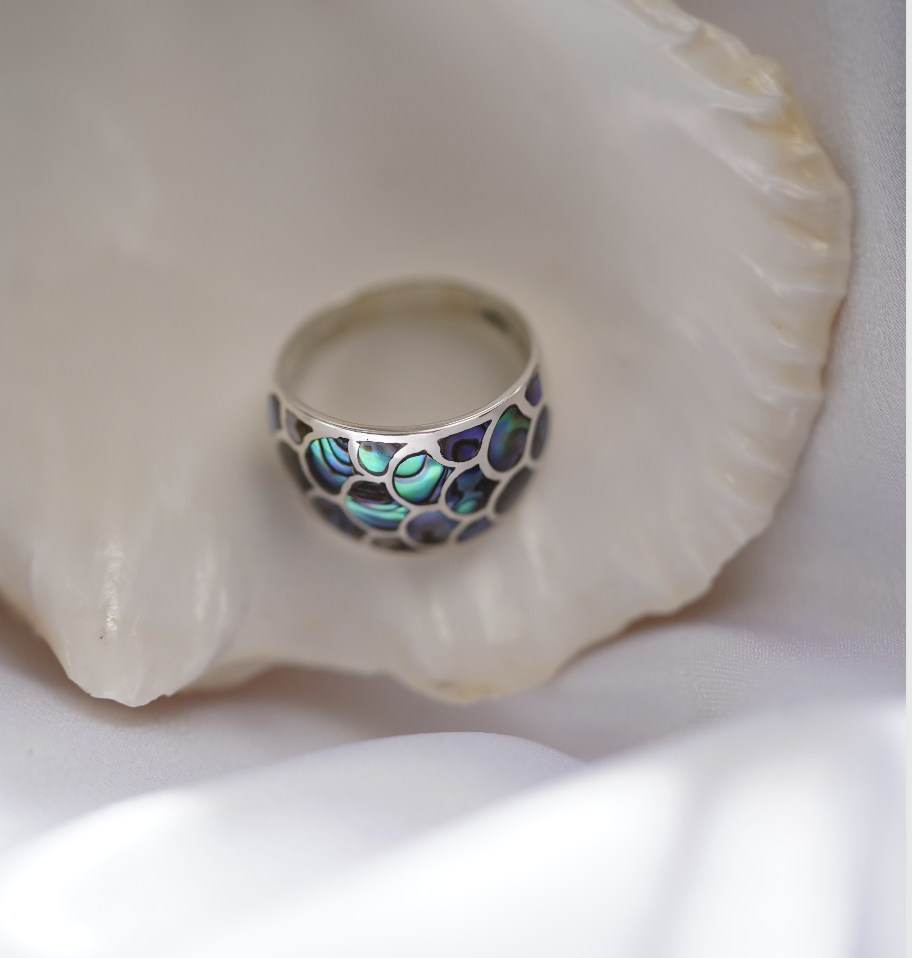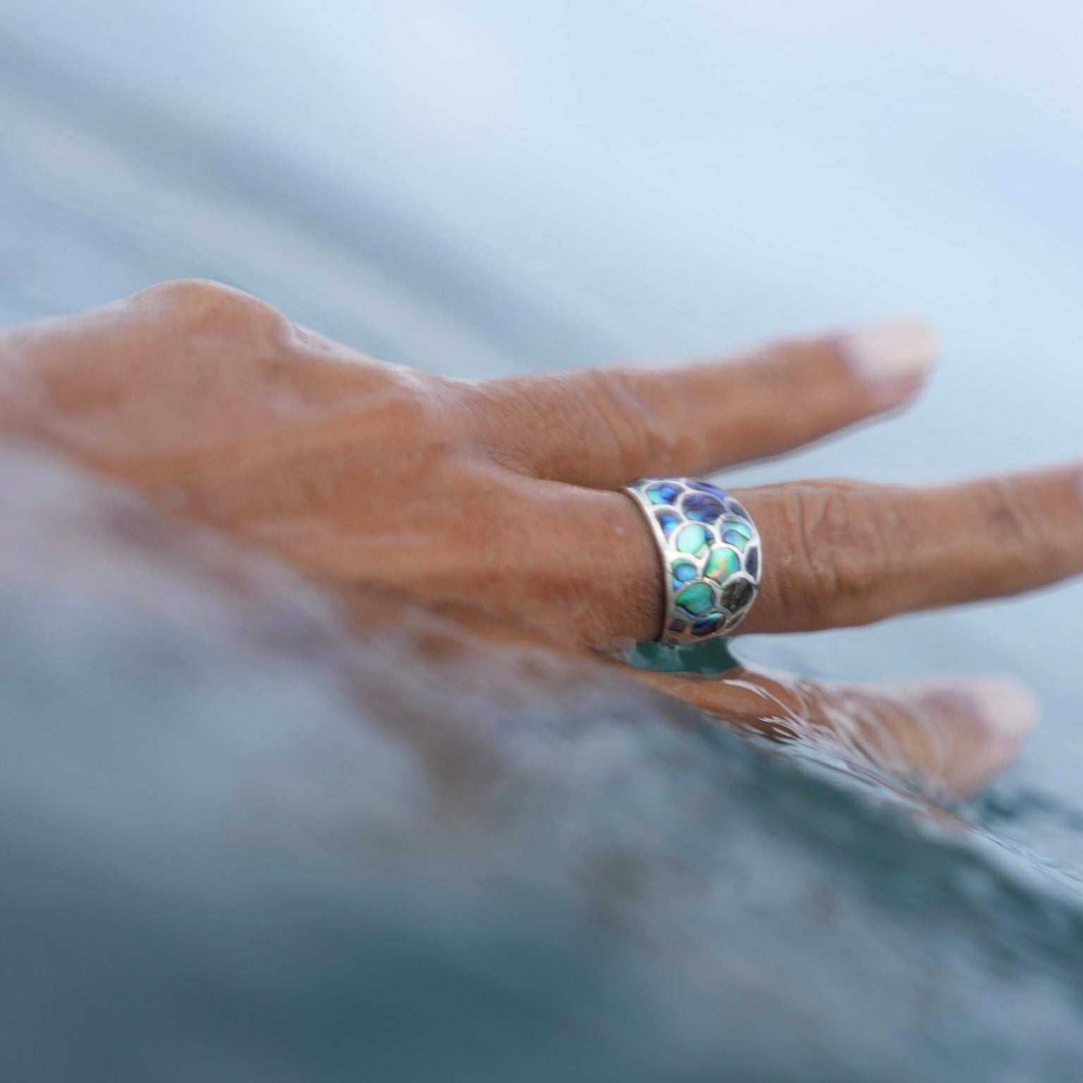 Anillo de plata con nácar oscuro que nos recuerda a una cola de sirena y al océano.
