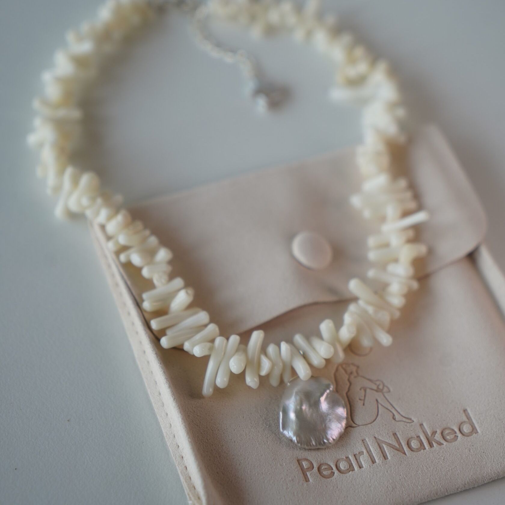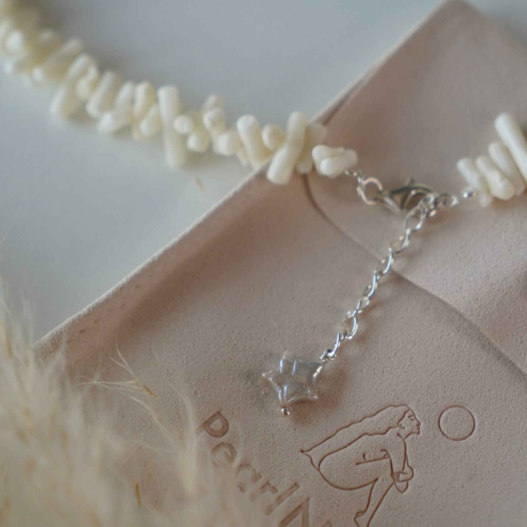 Gargantilla de color blanco coral que luce una gran perla plana, elegantemente prolongada 4cm mediante una extensión de plata.