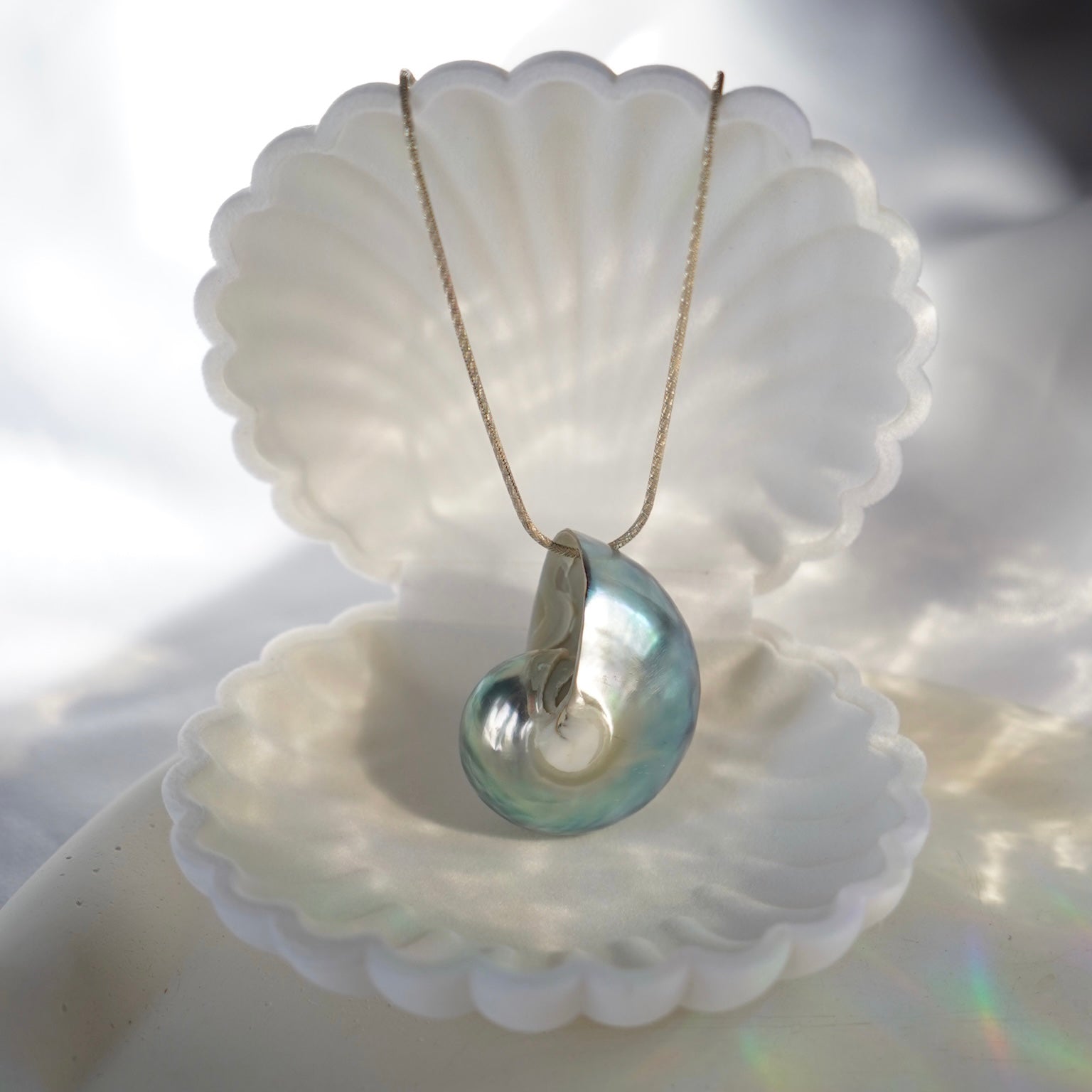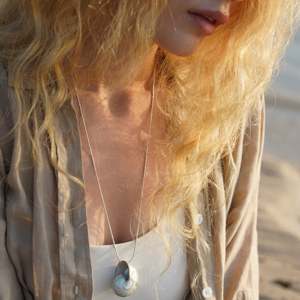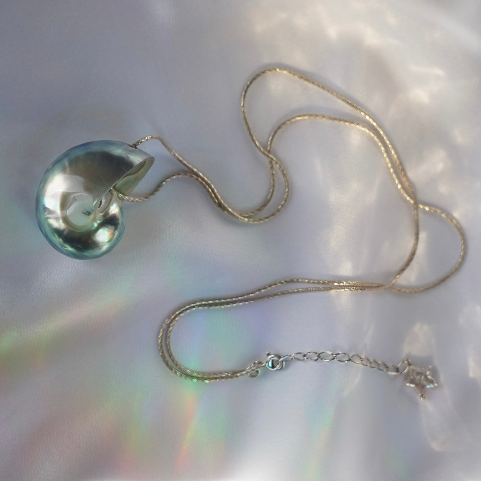 Gran concha brillante sobre cadena de plata, complementada con extensión de perla estrella, de 62 cm de largo.