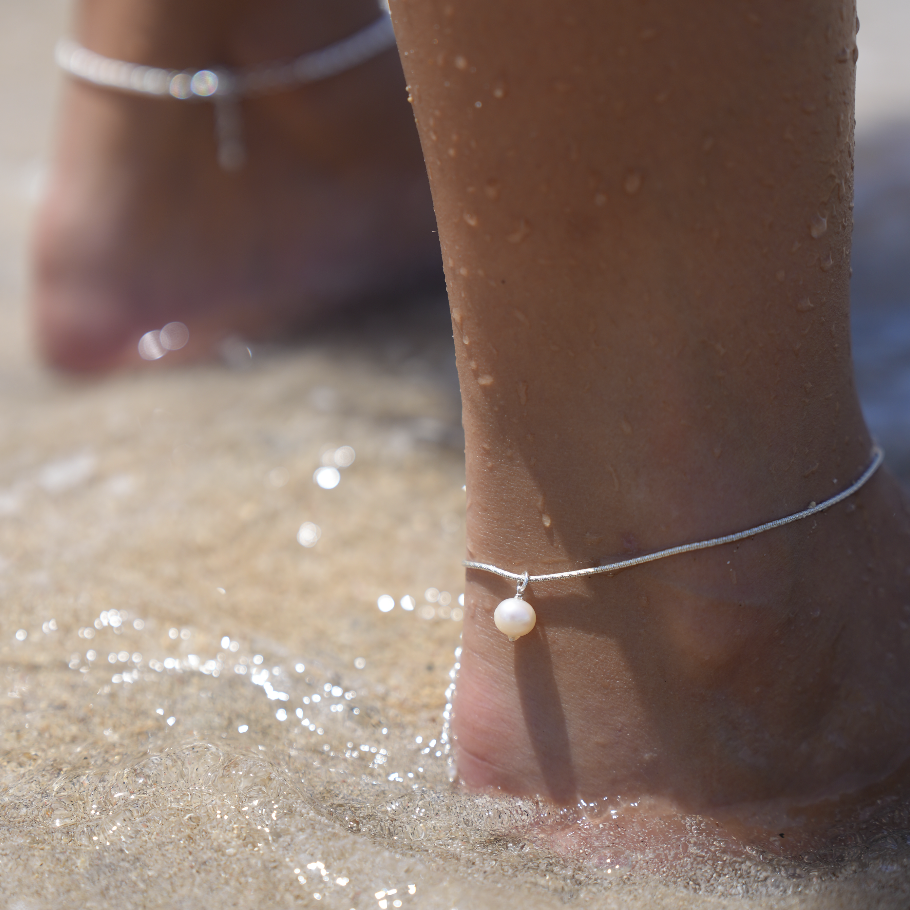 Una pulsera de tobillo de plata adornada con perlas deslizantes de gran tamaño, sujeta mediante un broche de plata.