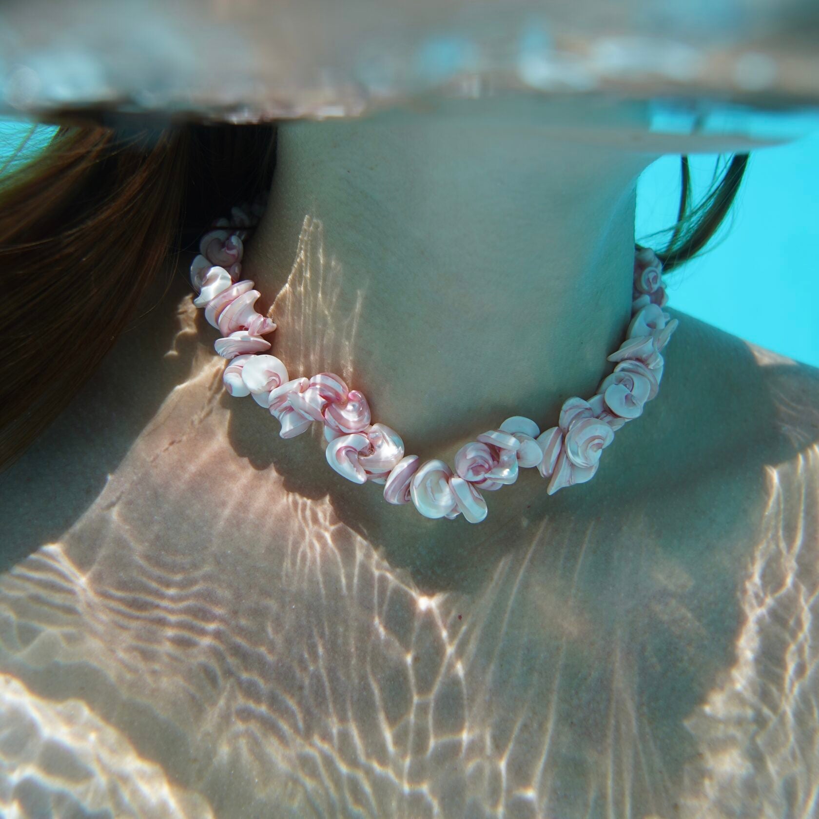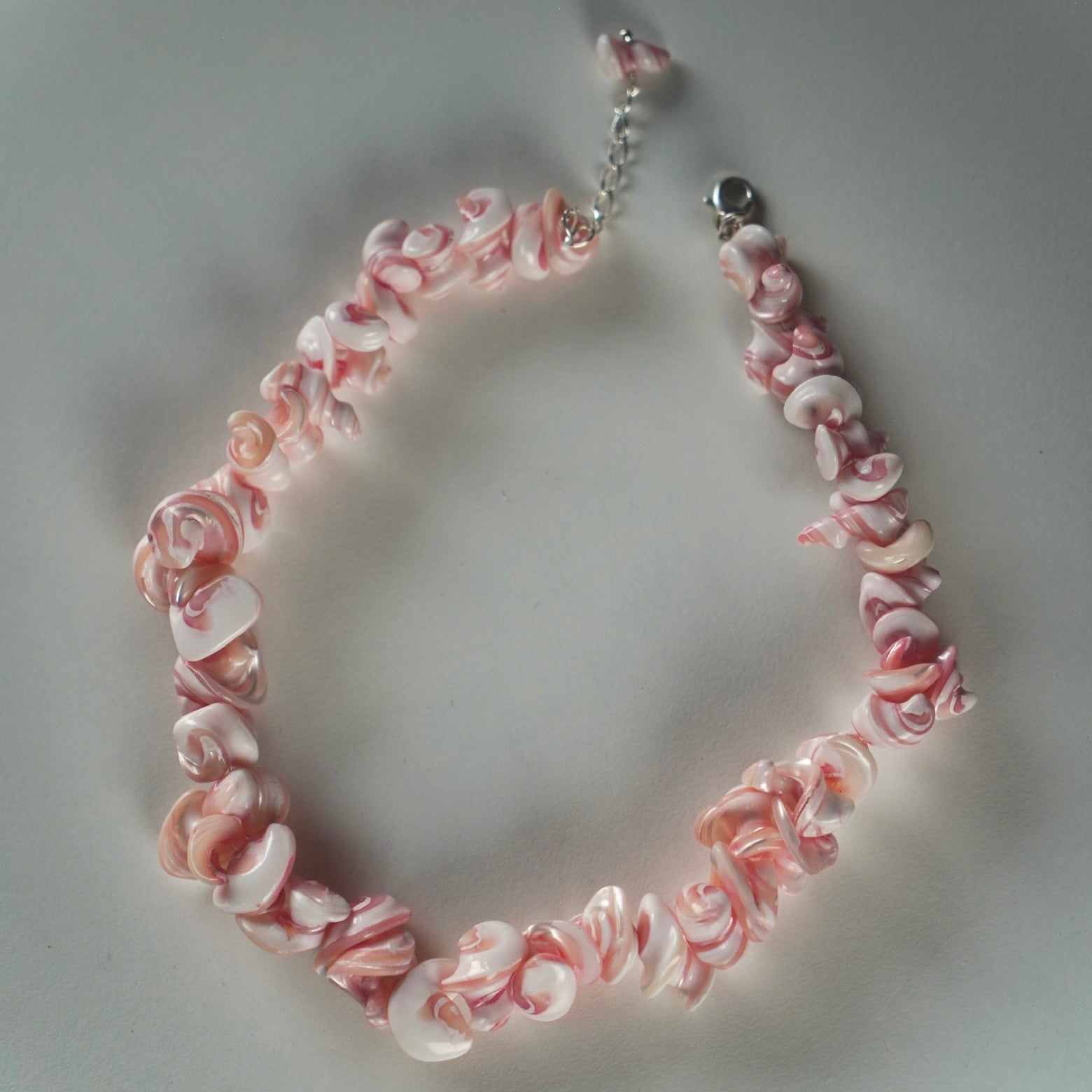 Detalles: gargantilla de 33cm de largo con extensión de plata 925 de 4cm de largo y trozo de concha rosa en el extremo.