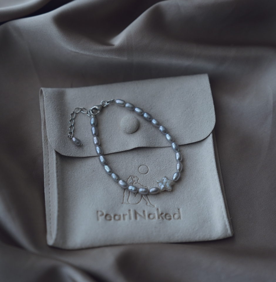 Pulsera elaborada con perlas ovaladas de color gris oscuro y estrella de perla de color gris oscuro en el medio, asegurada por un cierre de plata con extensión y delicadamente terminada con una perla en el extremo.