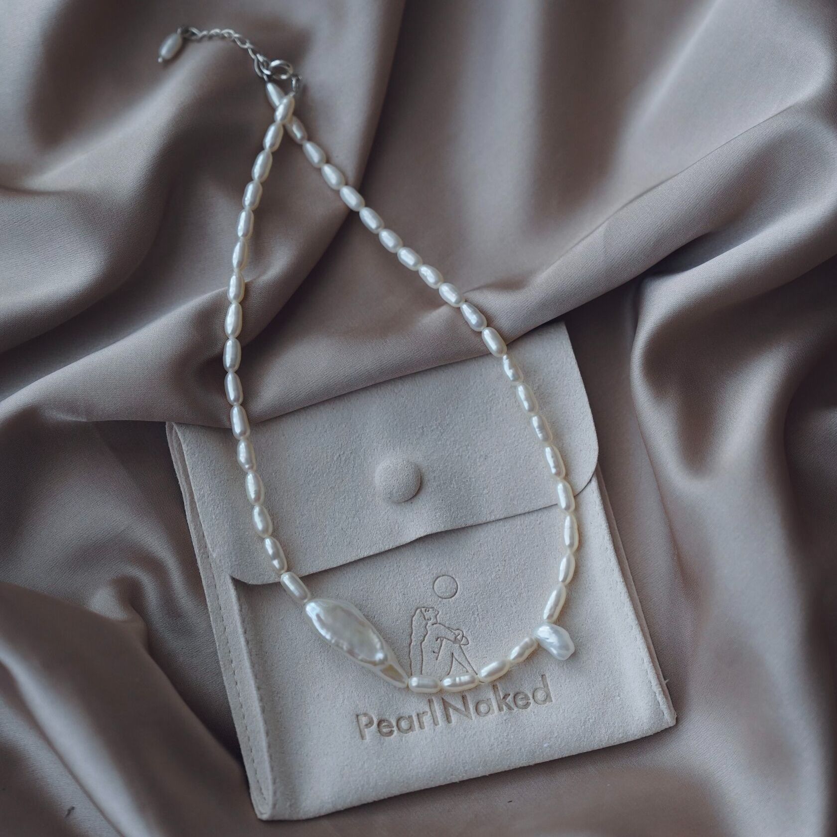 Gargantilla de perlas con una perla barroca asimétrica única combinada con perlas pequeñas. Completa con una extensión de plata de 4 cm, garantiza un ajuste personalizado y elegante.