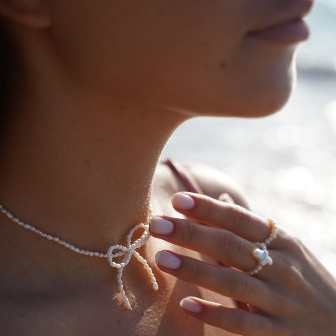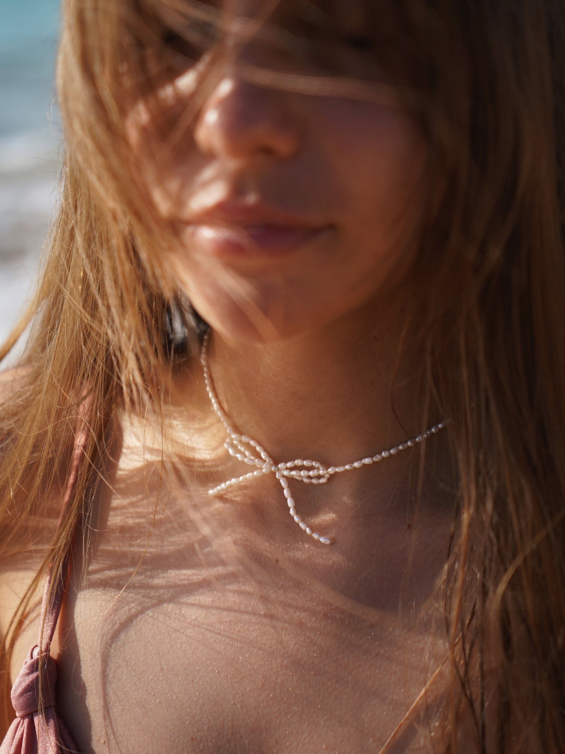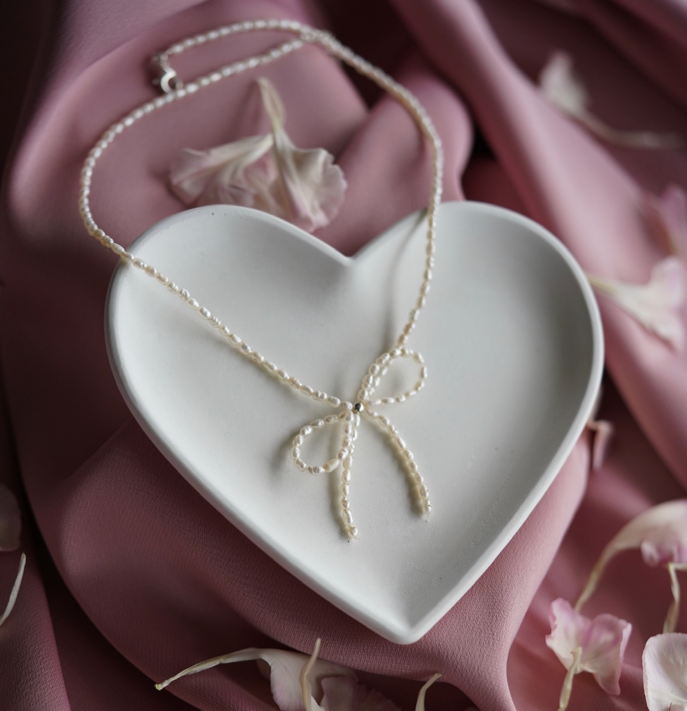 Nuestra gargantilla con pequeñas perlas de agua dulce delicadamente adornada con un lazo. Se completa con una extensión de plata de 4 cm.