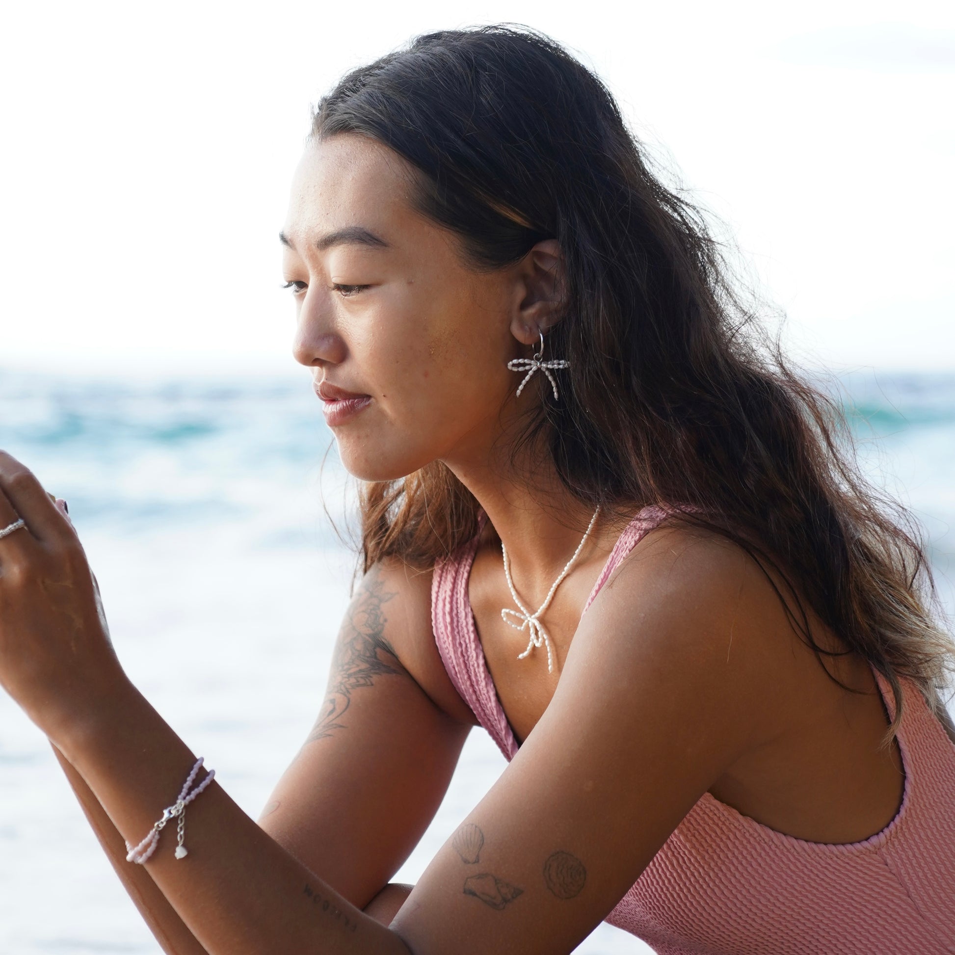 Pendientes realizados con diminutas perlas de agua dulce colgando de un aro de plata.