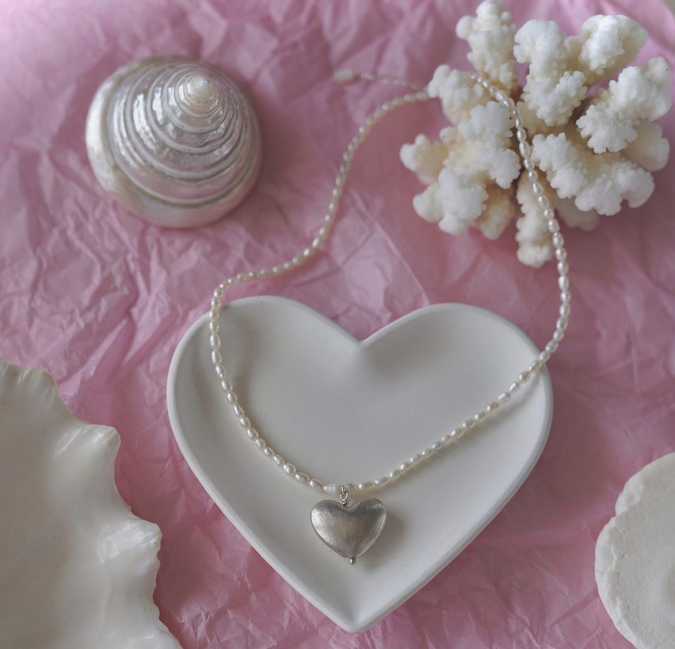 Corazón de plata de tamaño mediano acentuado por perlas medianas, acompañado de una extensión de perla, que mide 36 cm.