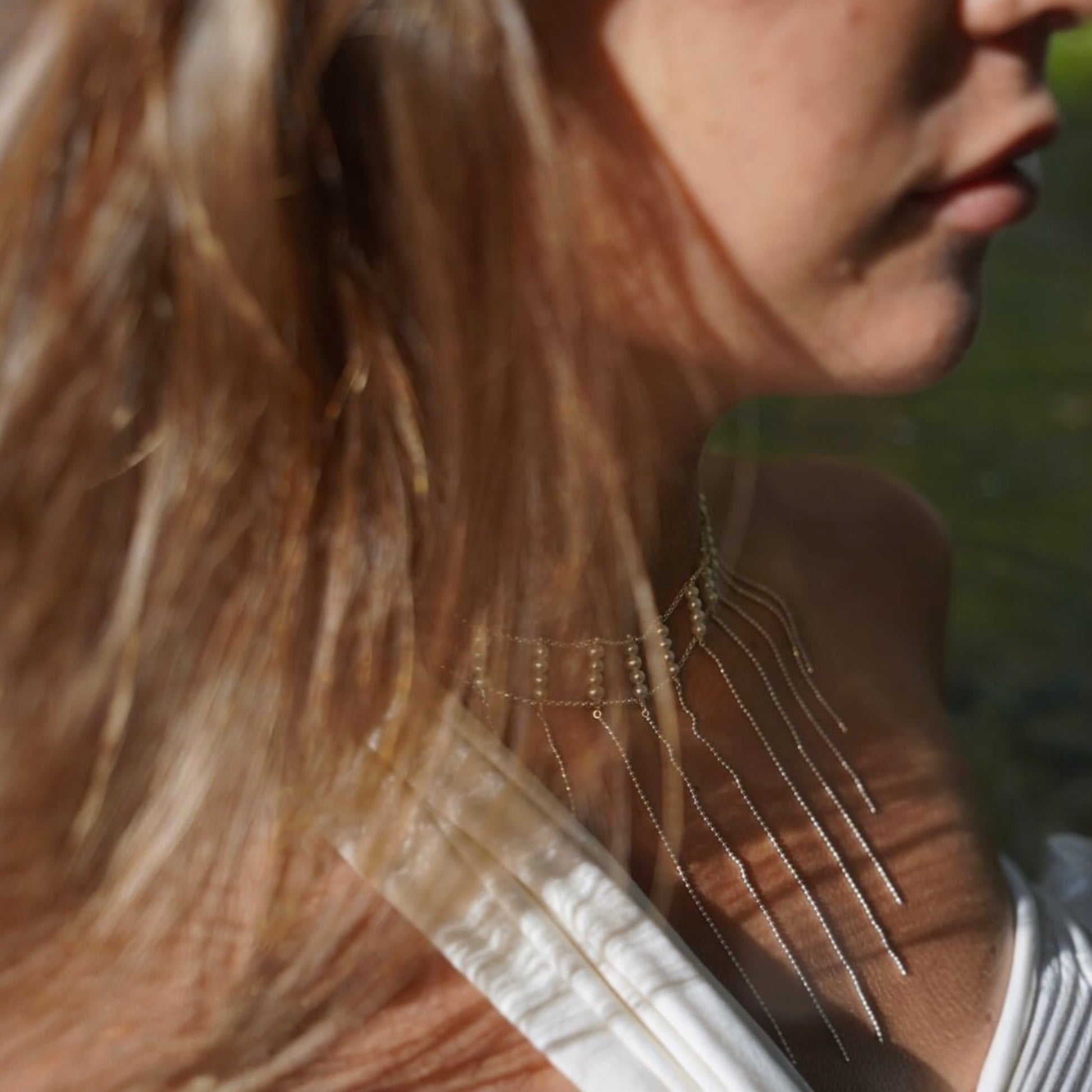 Nuestra gargantilla de plata, elegantemente adornada con perlas y cadenas en cascada para un toque de elegancia atemporal.
