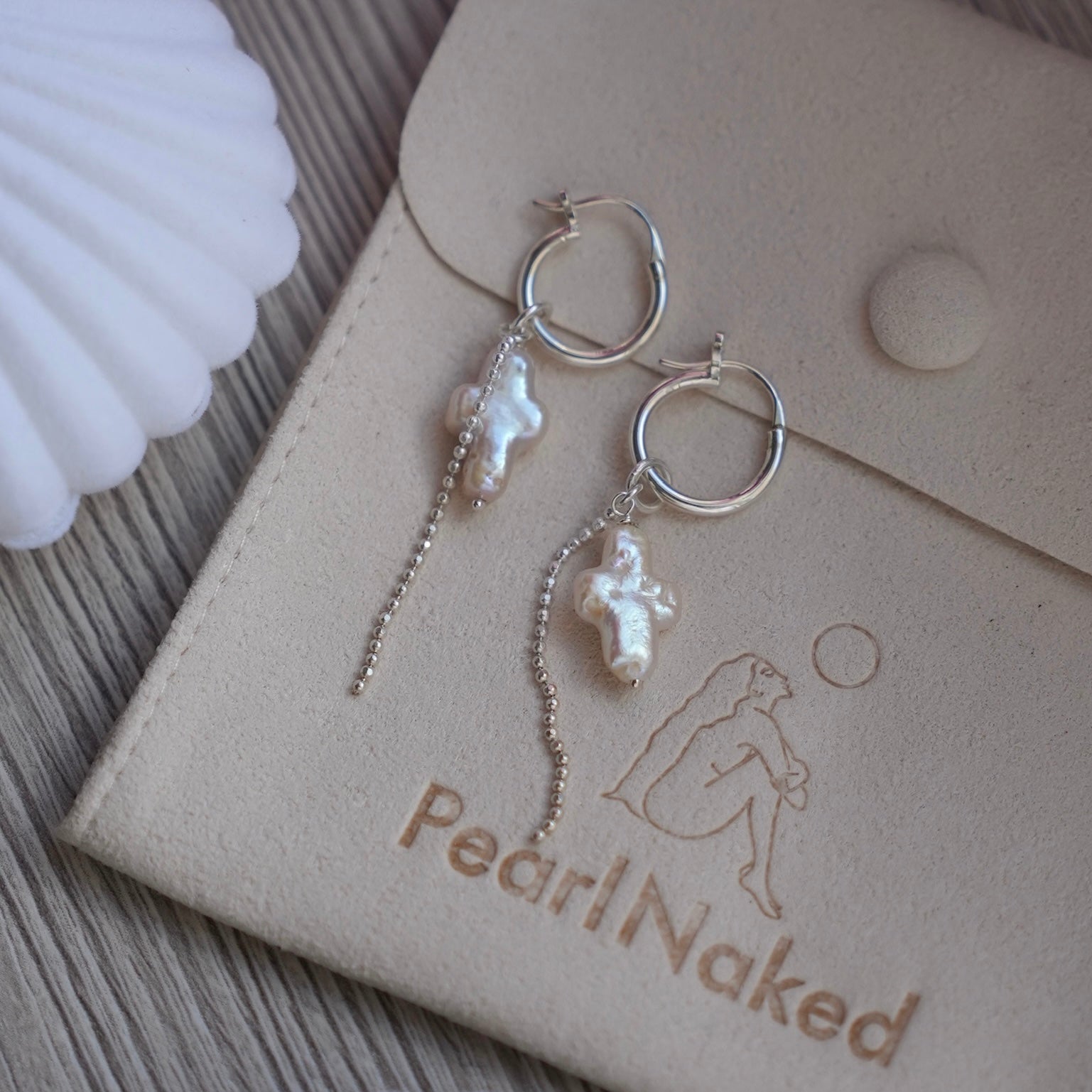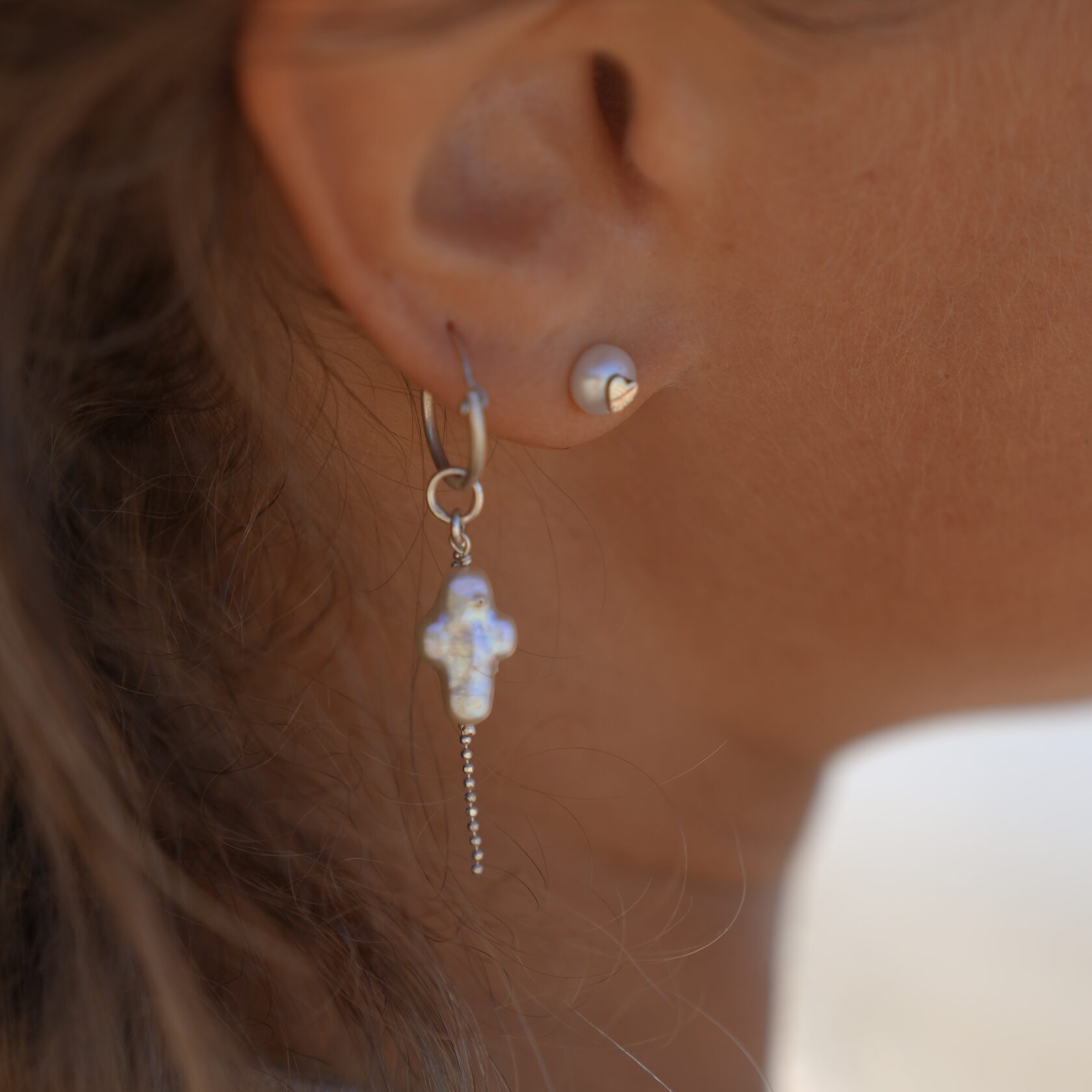 Pendientes de plata con una llamativa perla brillante cruzada. Estos pendientes, elaborados meticulosamente, añaden un toque de misterio y refinamiento a cualquier look.
