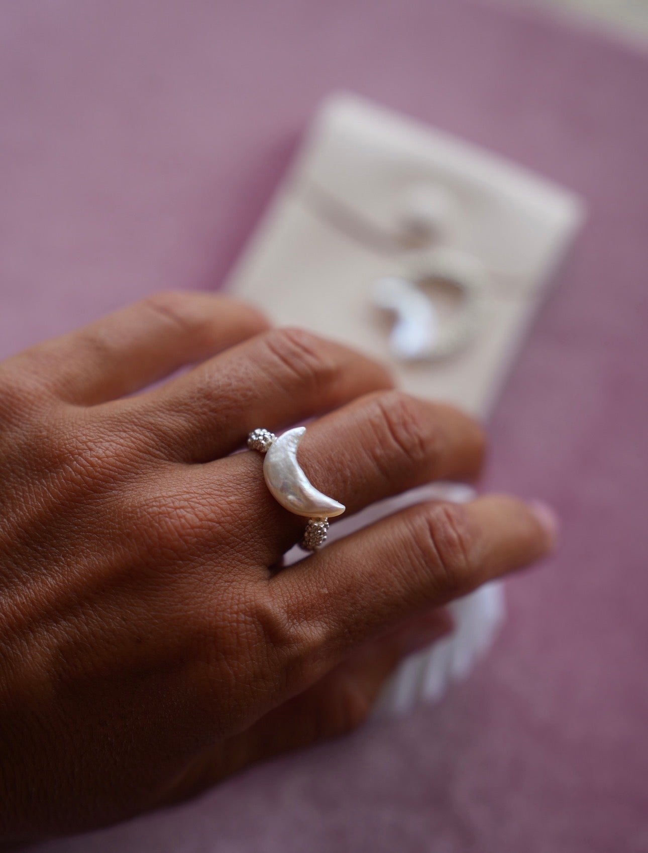 Inspired by moonlight over quiet waters, the Reef Luna Ring captures the magic of the ocean at night. Polished 925 sterling silver beads shimmer like reflected tides, while a natural crescent pearl rests at the center — luminous, organic, and beautifully unique.