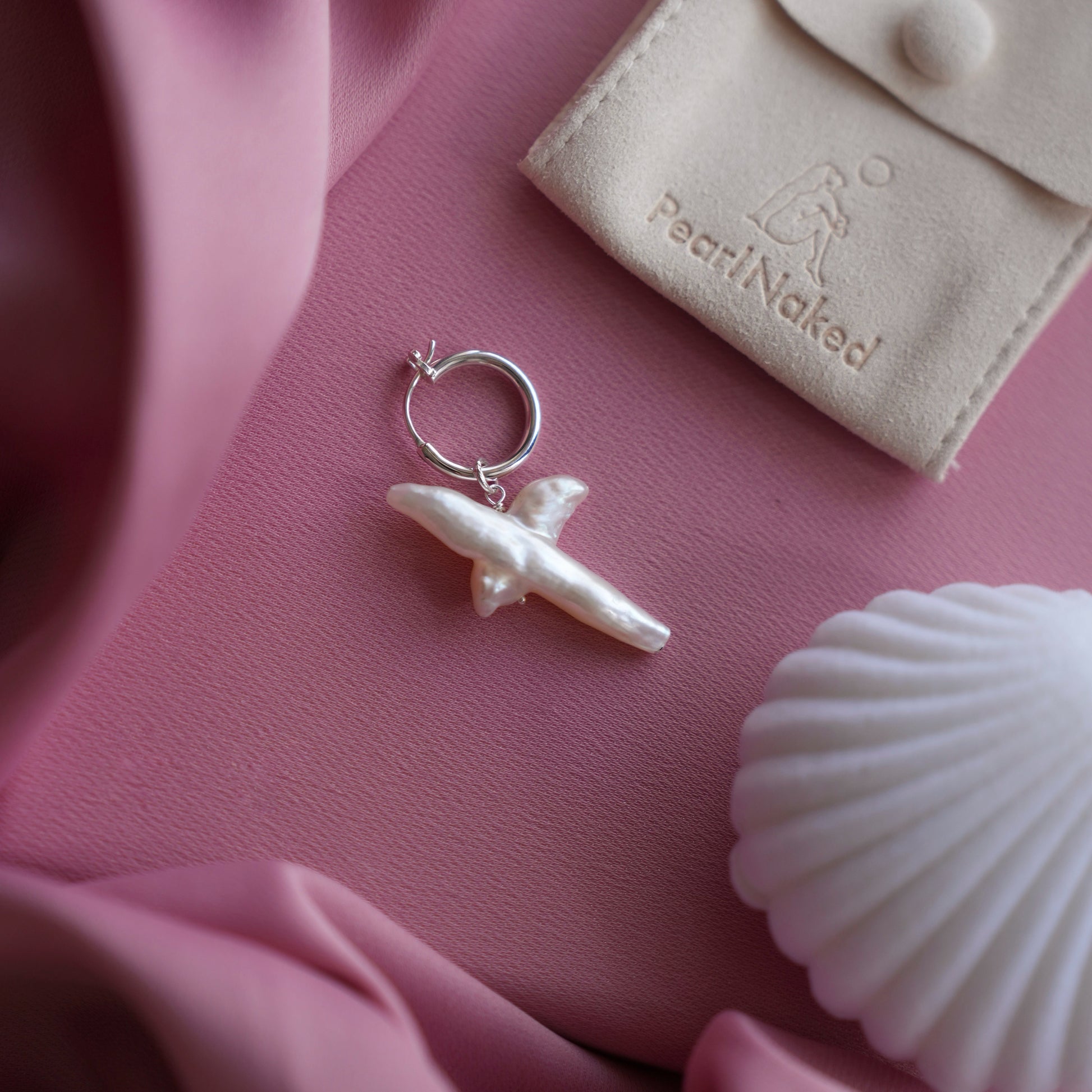 A large, uneven natural pearl — reminiscent of a bird in flight — hangs from a polished 925 silver hoop. With its sculptural shape and soft luster, each pearl is completely unique, adding a sense of movement and individuality to your look.