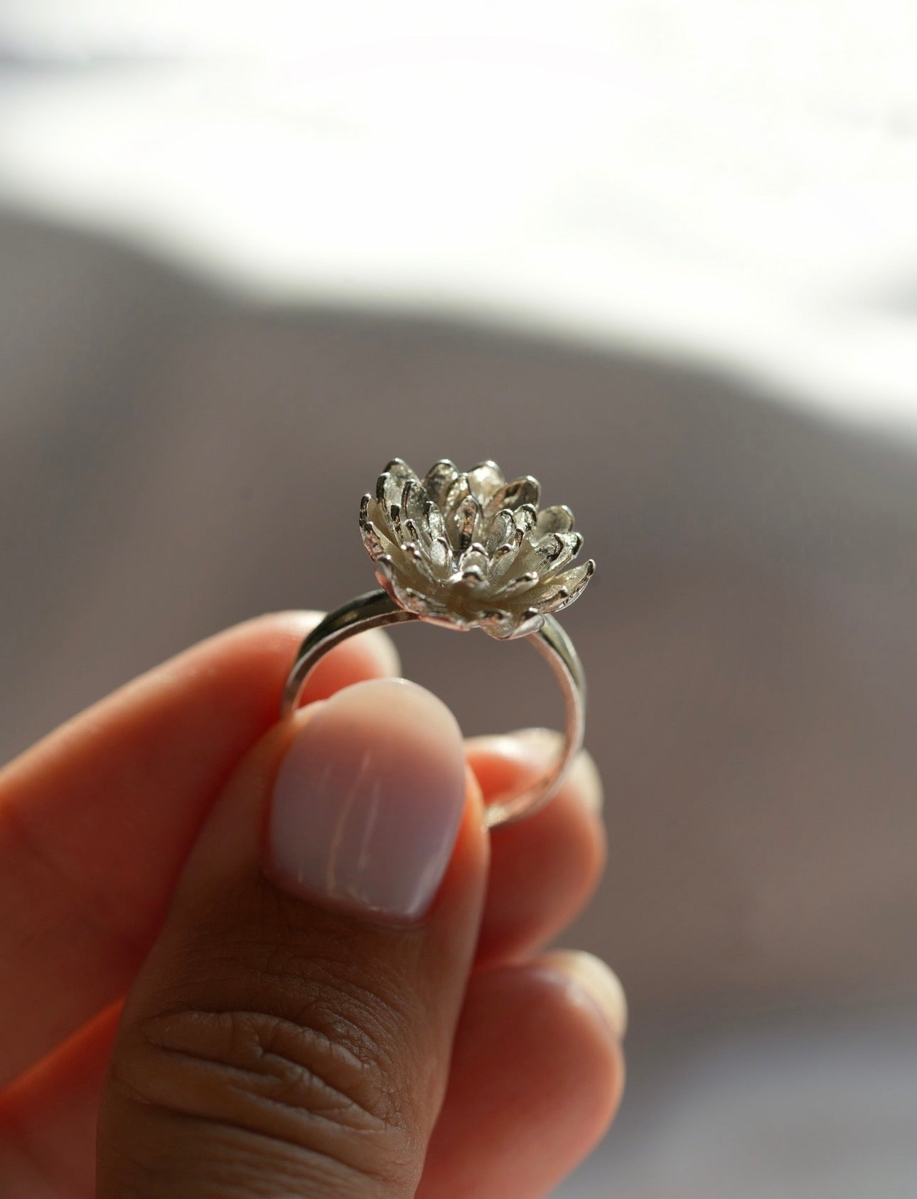 Refined silver lotus-flower ring that captures purity and graceful simplicity